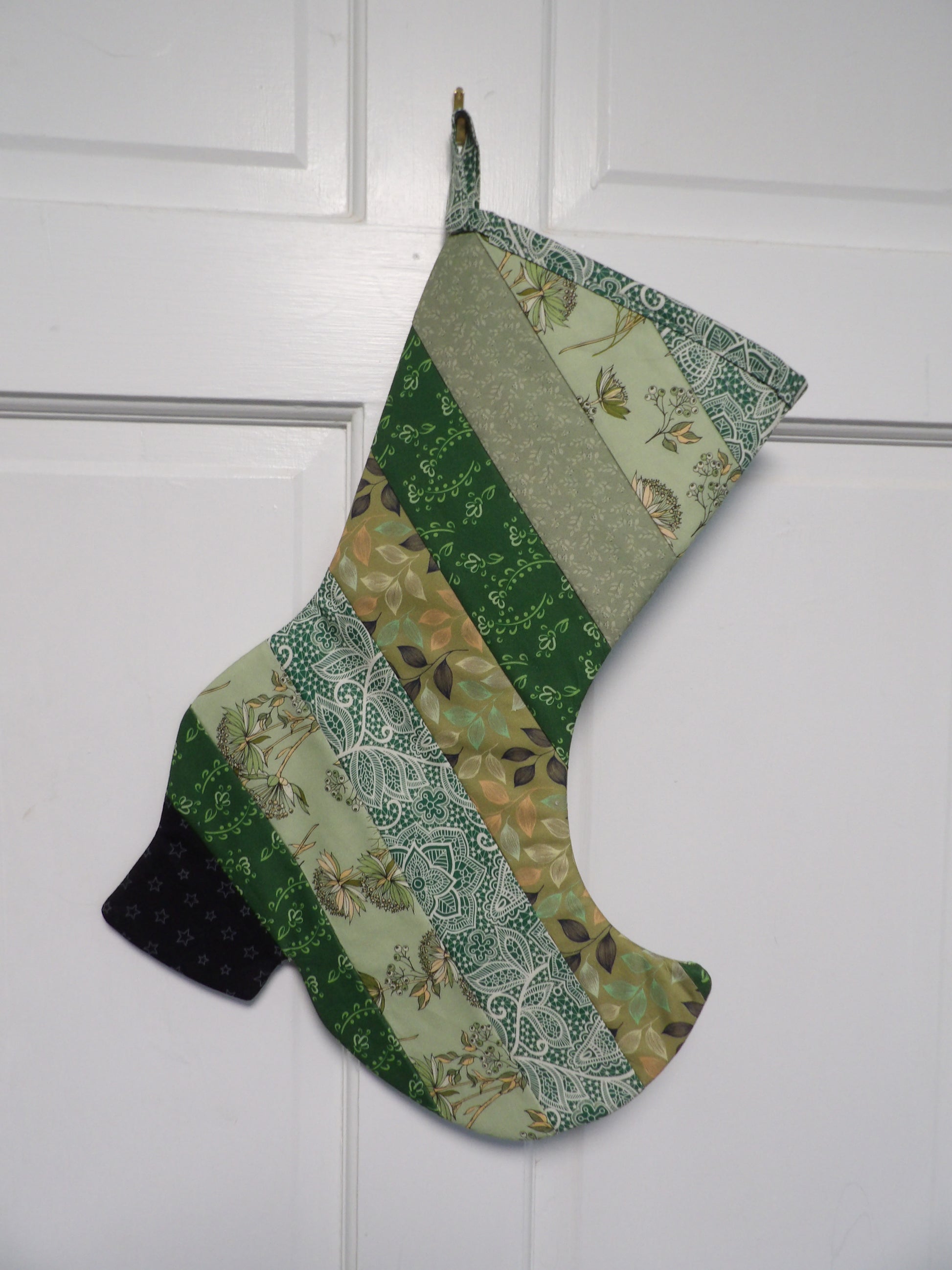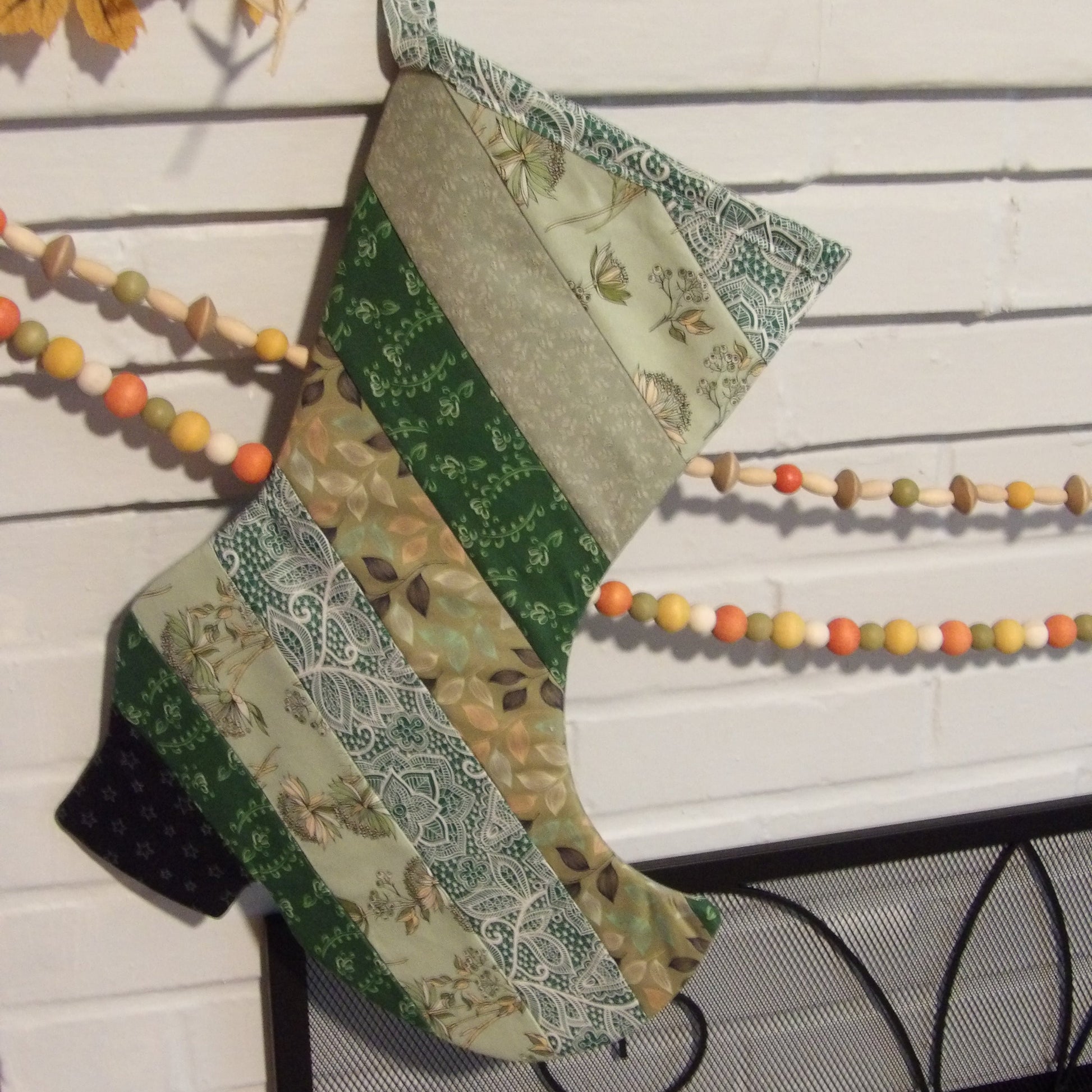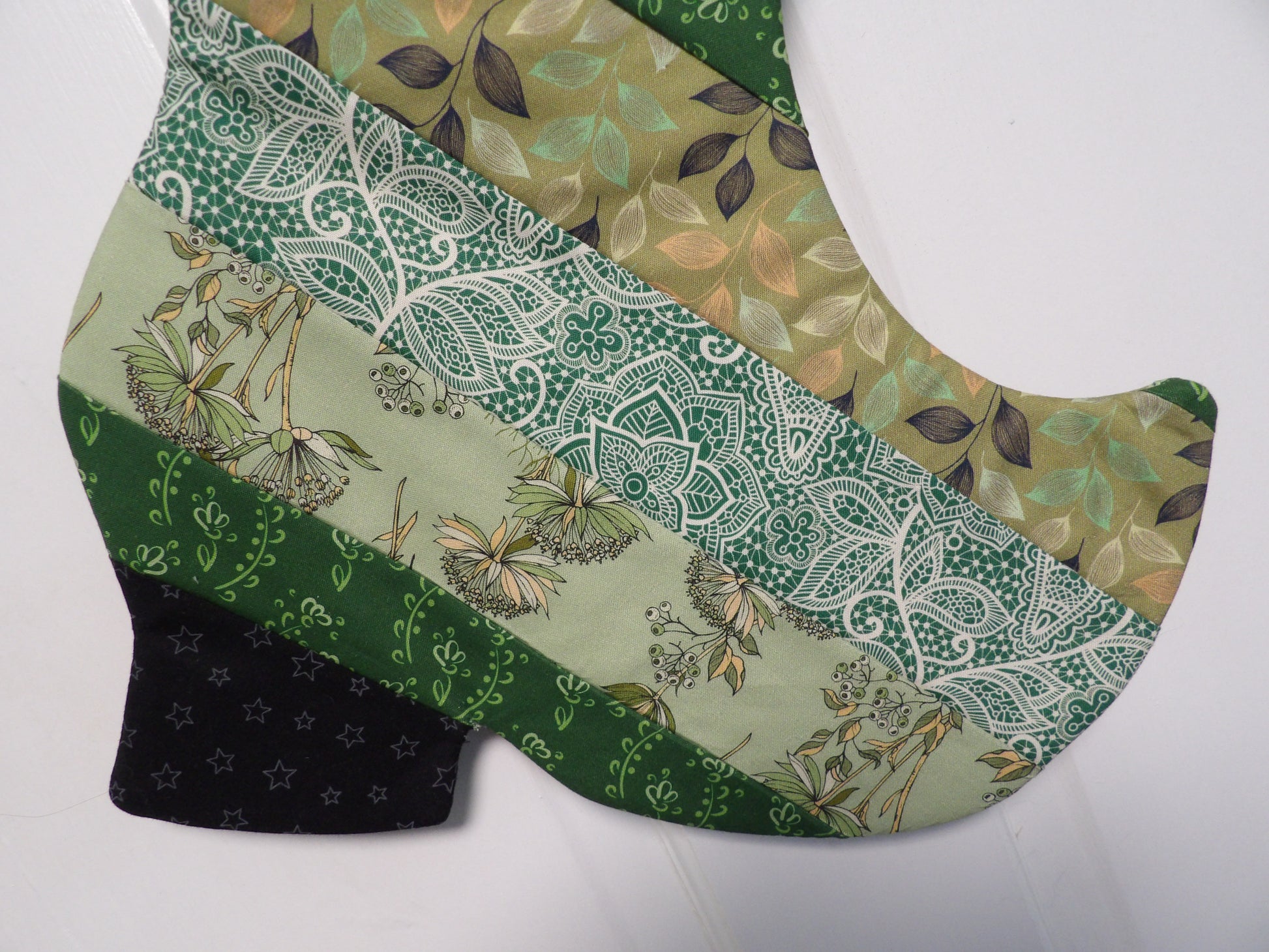 Quilted with fabrics in various shades of green, this stocking in the shape of a witch's boot is 17.5" tall not counting the loop to hang it, and 13.5" wide at it's widest point, so it's ready to hold lots of goodies (or coal, depending on your situation). It's fully lined in a neutral floral fabric.