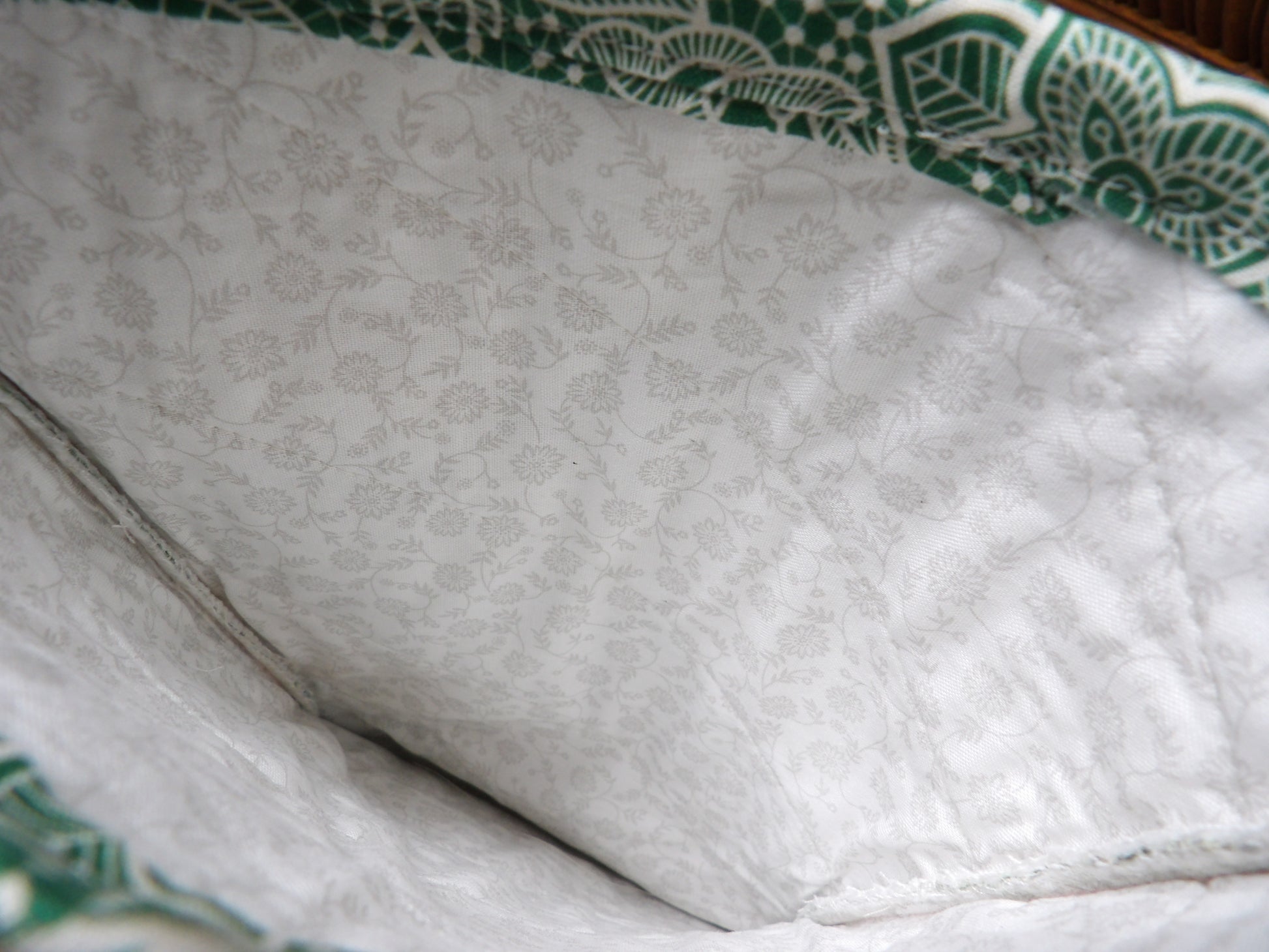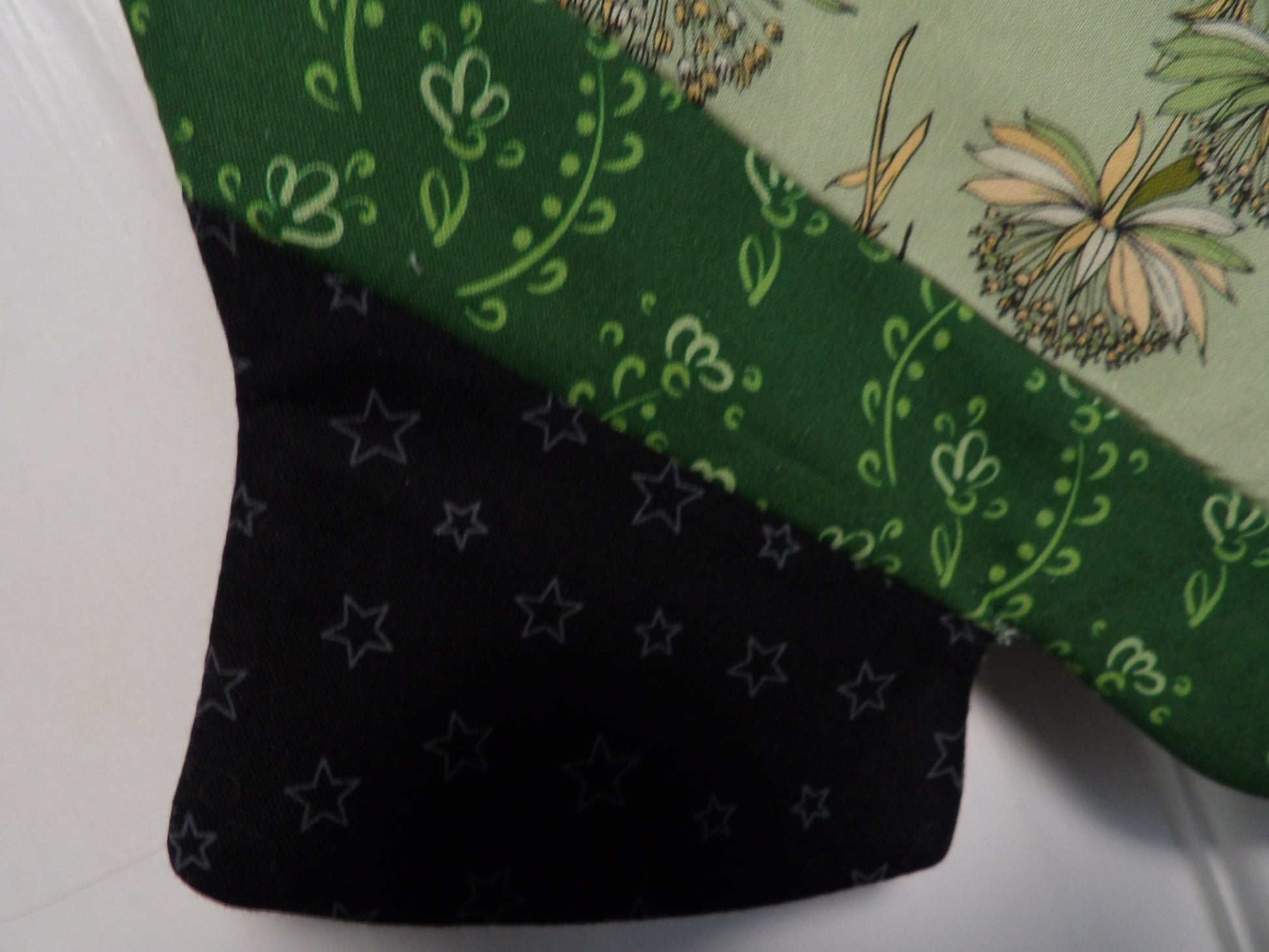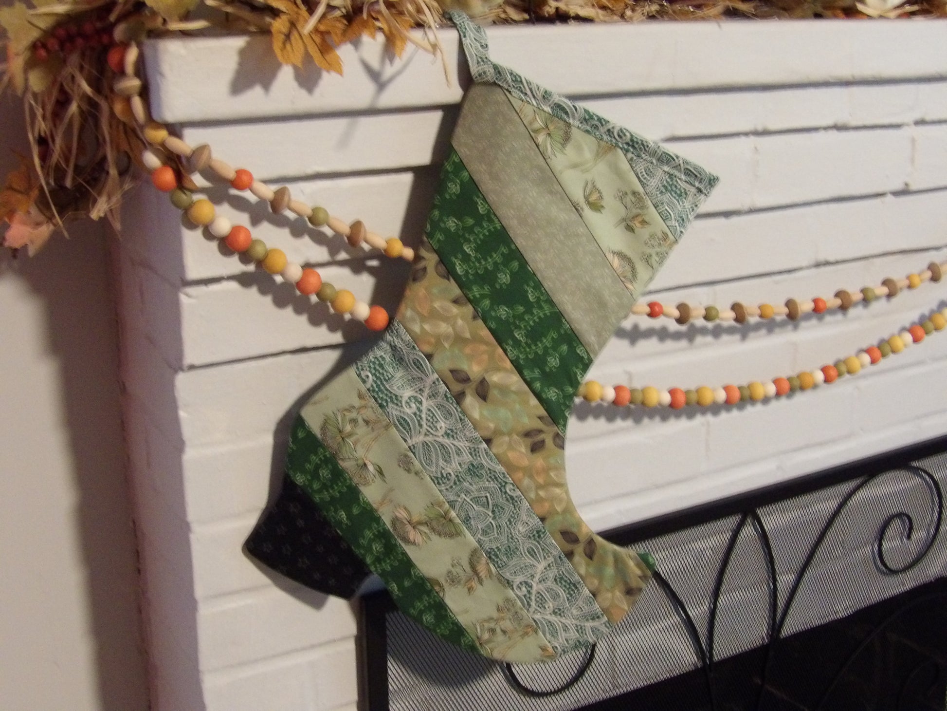 Quilted with fabrics in various shades of green, this stocking in the shape of a witch's boot is 17.5" tall not counting the loop to hang it, and 13.5" wide at it's widest point, so it's ready to hold lots of goodies (or coal, depending on your situation). It's fully lined in a neutral floral fabric.